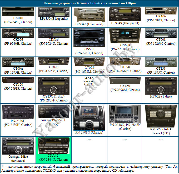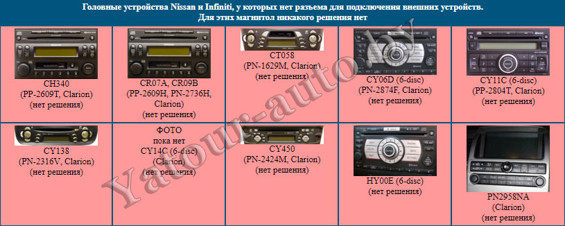 Совместимые головные устройства: BOSE, Clarion, Panasonic. Теперь поддерживаются автомобили, выпущенные для Североамериканского и Канадского рынков.